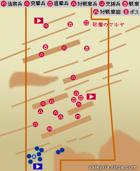 右側の占拠した陣から偵察猟兵を北へ進め、砂塵のマルヤをグレネード等で倒します。